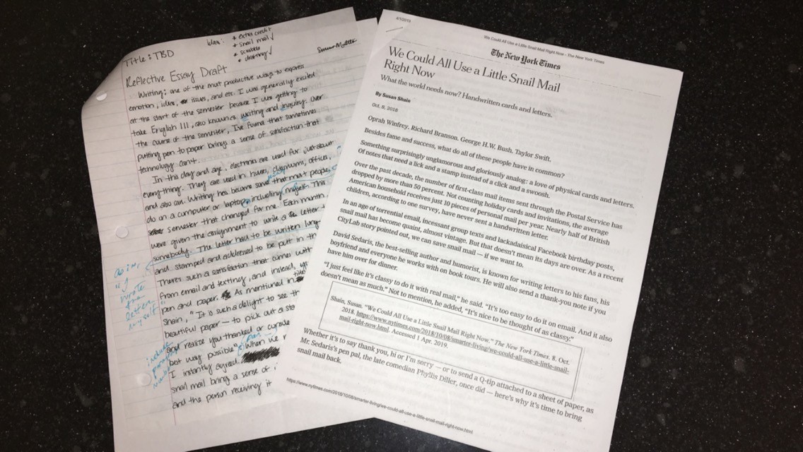 In this day and age, electronics are used for just about everything. They are used in houses, classrooms, offices, and also cars. Writing has become something that most people, including I, do on a computer or laptop. This semester that changed for me. Each month, we were given the assignment to write a letter to somebody. The letter had to be written long-hand and stamped and addressed to be put in the mail. There’s such a satisfaction that comes with escaping from email and texting, and instead, writing with pen and paper. As mentioned in “We Could All Use a Little Snail Mail Right Now” by Susan Shain, “it is such a delight to see that ink go on that beautiful paper – to pick out a stamp, to slow down and realize you thanked or consoled somebody in the best way possible” (par. 9). When we read this passage in class, I instantly agreed. Taking the time to write snail mail brings a sense of joy and meaning to both you and the person receiving it that text or email can’t do.